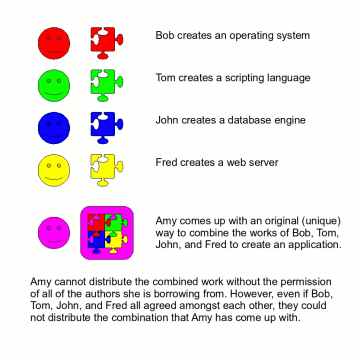 This creates a sort of gridlock, because if the original author and the owner of the derivative work cannot come to a compromise of their rights, then *neither* can propagate the derivative work.